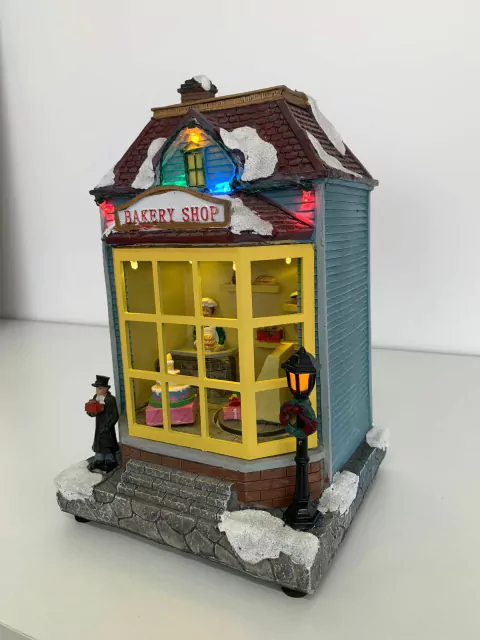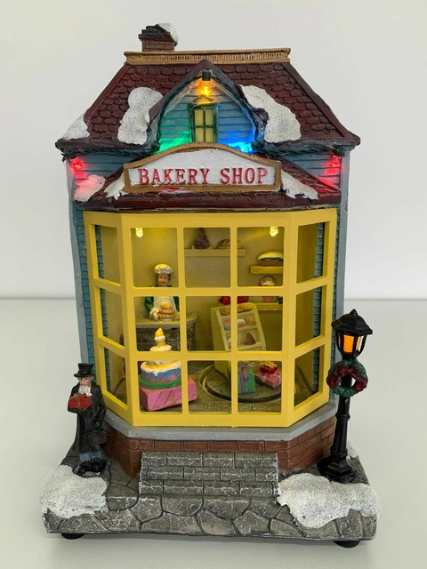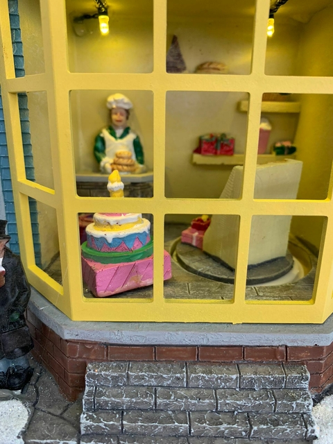 Vila de Natal Confeitaria com movimento, luzes e música.