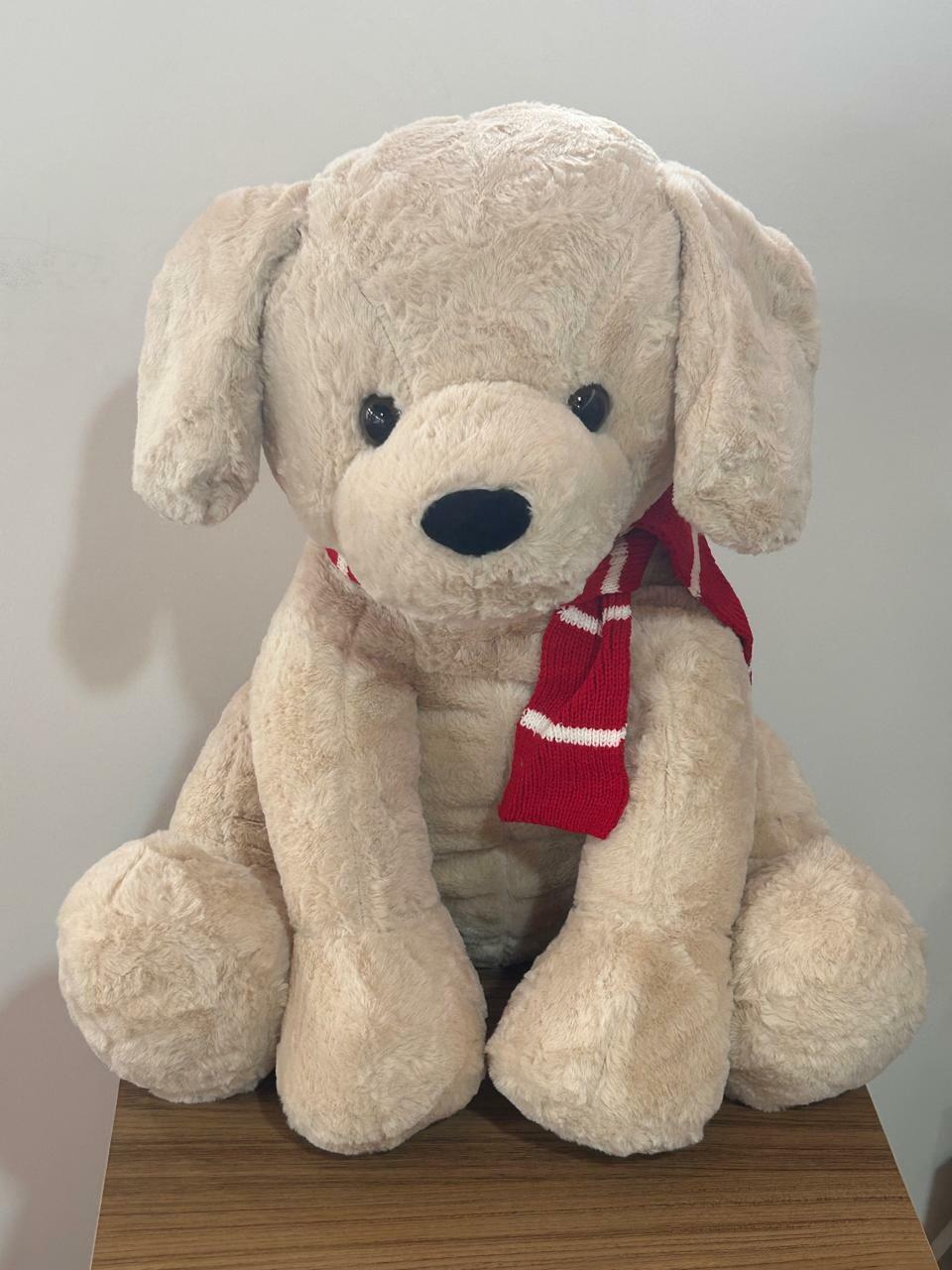 Cachorro pelúcia com cachecol vermelho e branco com 50cm de altura