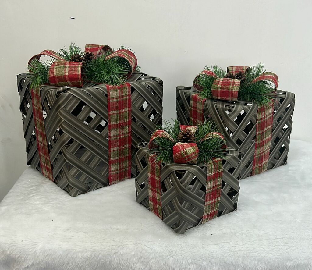 Caixa de presente decorativa com laço xadrez 3 pçs