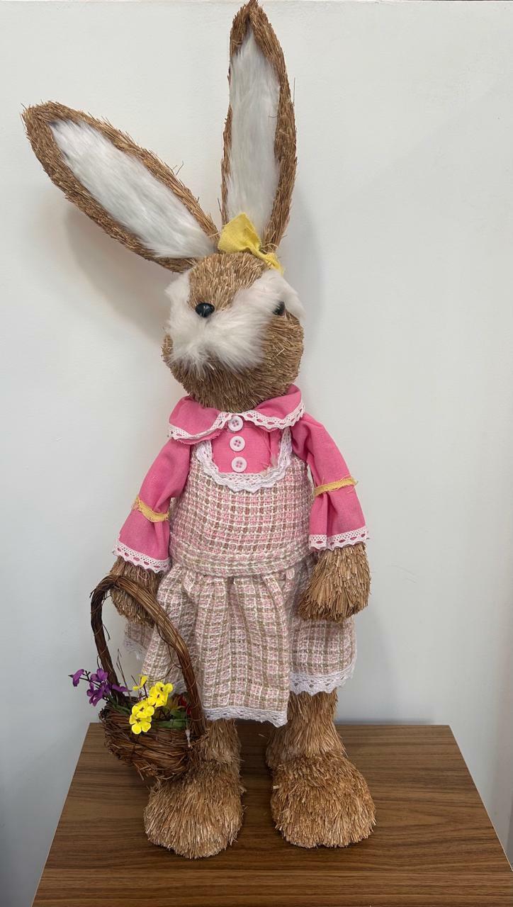 Coelha rústica em pé com vestido xadrez com 71cm de altura.