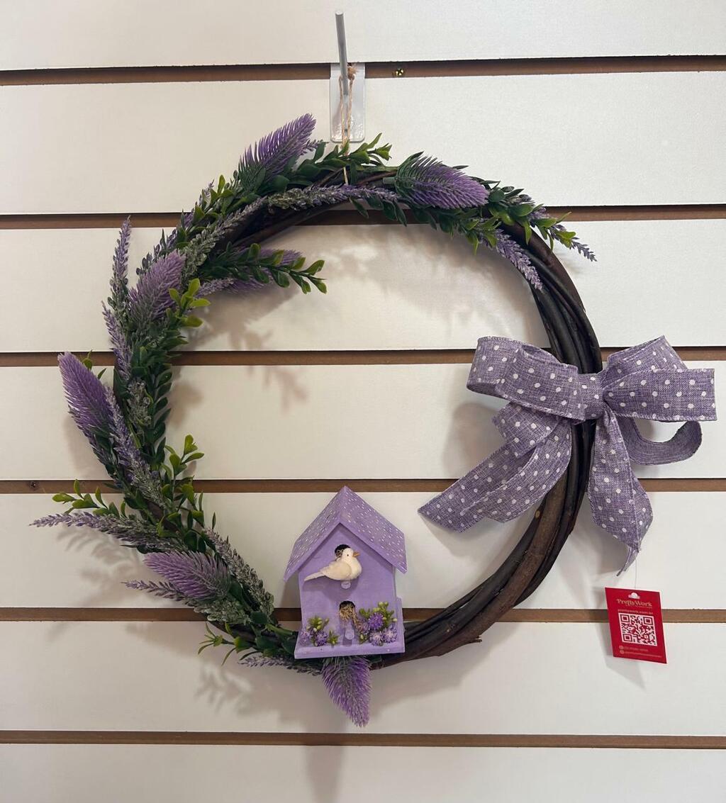 Guirlanda de vime atemporal com casinha e lavandas com 35cm de diâmetro.