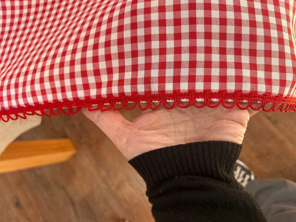 Toalha de mesa xadrez vermelha e branca com barra, medida 1,40x1,40m